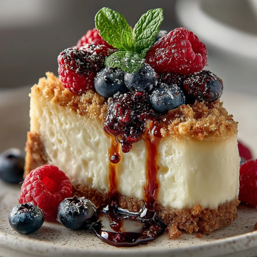 To prepare this rich and creamy cheesecake, you will need crushed digestive biscuits or graham crackers combined with melted butter to form a firm crust. The smooth cheesecake filling is made using cream cheese, sugar, eggs, heavy cream, vanilla extract, and a small amount of lemon juice to enhance the flavor. A simple crumble topping prepared with flour, butter, and sugar adds a lightly crunchy texture. The dessert is finished with mixed berries such as raspberries and blueberries along with a sweet berry sauce drizzled over the top. If desired, all mixed berries can easily be replaced with fresh strawberries or strawberry compote to create a delicious strawberry cheesecake variation without changing the preparation method.